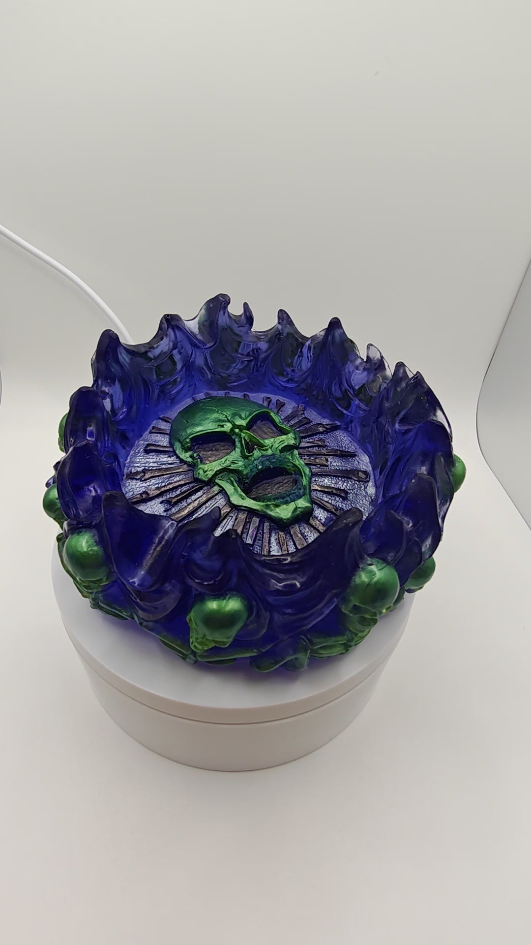 Crafted by hand from durable resin, this inspired Beetlejuice Skull Ashtray features a striking purple background adorned with vivid green skulls and skeletons. Its gothic design evokes a spooky, witchy atmosphere, perfect for Halloween enthusiasts or horror decor lovers. Beyond its eerie aesthetic, it functions as a practical tray, ideal for holding ashes or small items. This unique piece makes an exceptional gift and a distinctive addition to any collection seeking a blend of creepy charm and artisanal quality.
